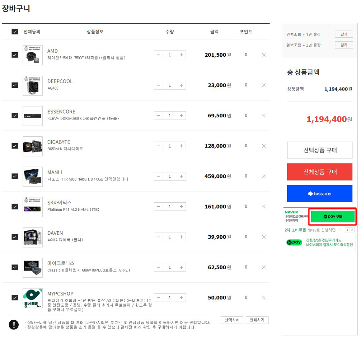 상품을 여러가지 담아 구매를 원하시는 경우 장바구니에 담으신 후 아래 이미지를 참조하여 구매 해주시면 됩니다.